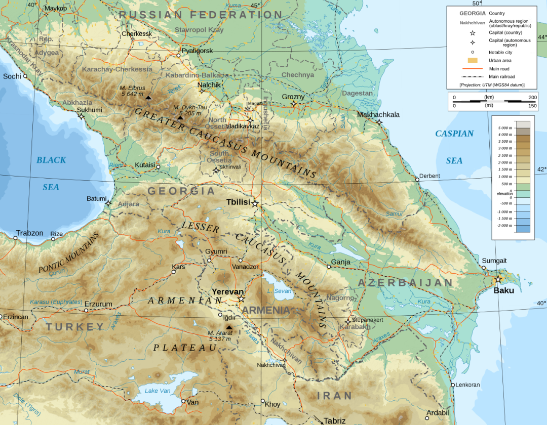 高加索分为南北两个大部分,以山脊为界——北边是欧洲,南边是亚洲。南边包括格鲁吉亚、亚美尼亚、阿塞拜疆三个被联合国承认的独立主权国家,除此之外还有三个事实独立但未被联合国承认的小国家——阿布哈兹、南奥赛梯、纳戈尔诺-卡拉巴赫共和国(简称“纳卡”,最近亚美尼亚跟阿塞拜疆打仗其实就是这个地方打的),这块地方称为“外高加索”