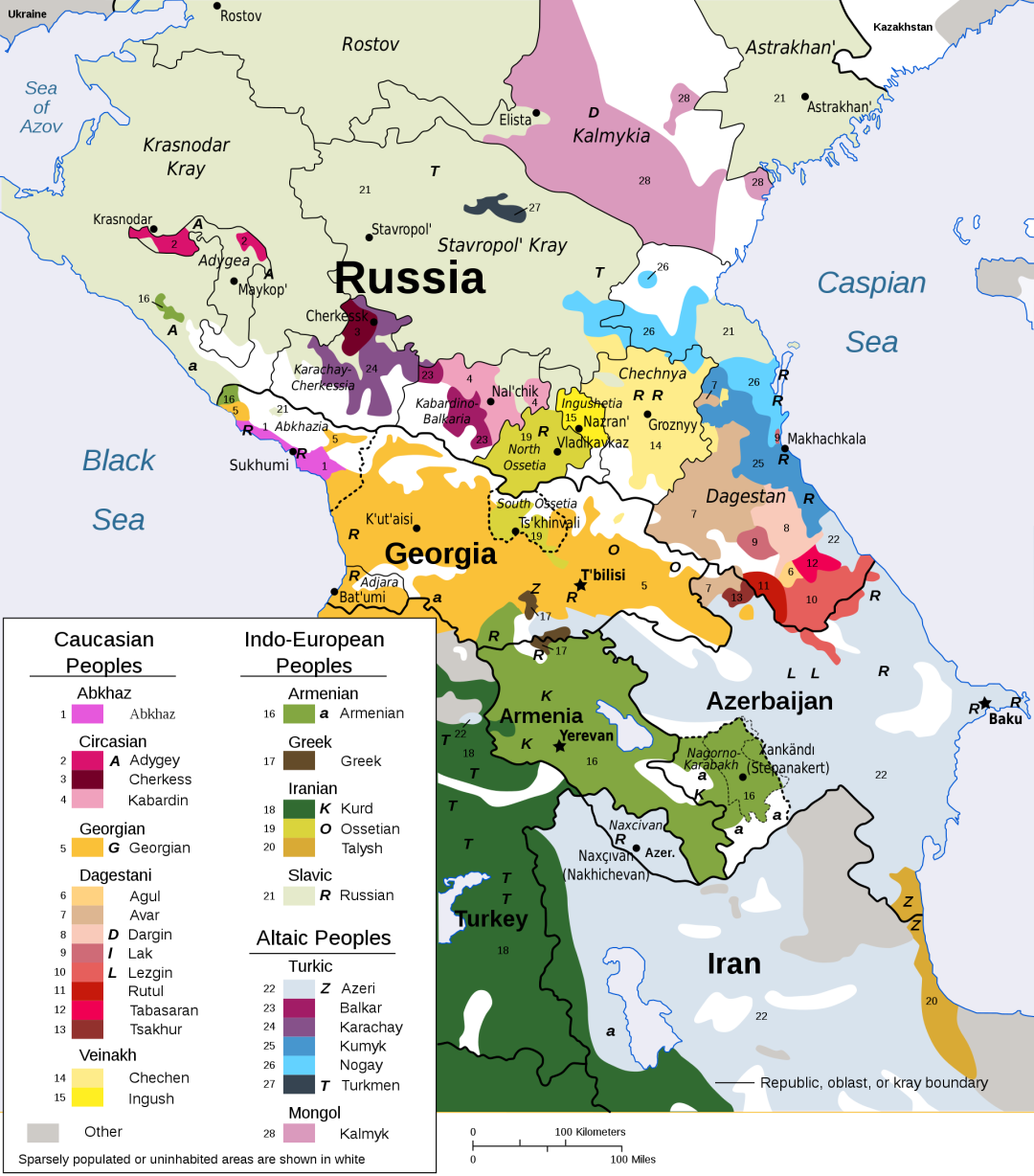 高加索地区大致的民族分布,光是图上显示出来的就有28个民族