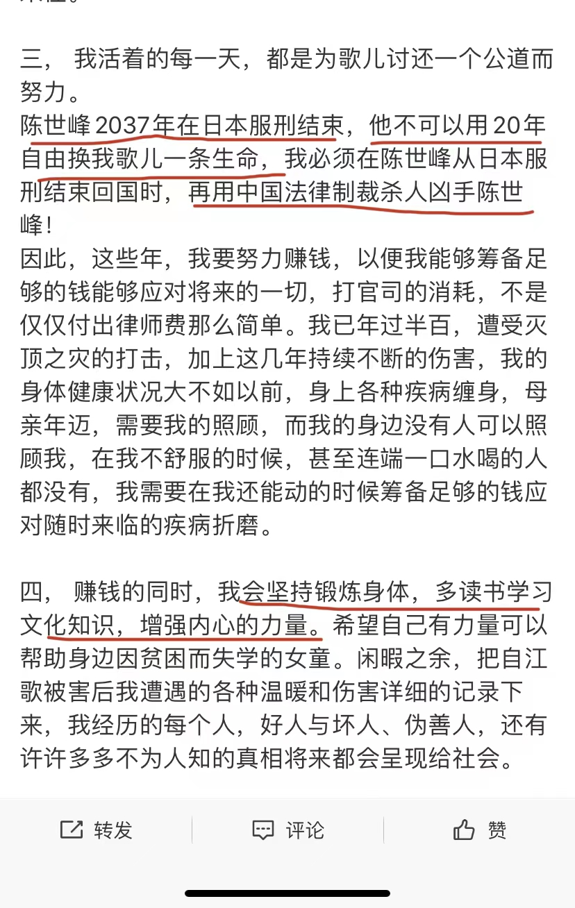 江歌妈妈表示,待到2037年,陈世峰在日本服刑完毕,引渡回国,江歌妈妈会继续为女儿用中国的法律制裁杀人凶手。