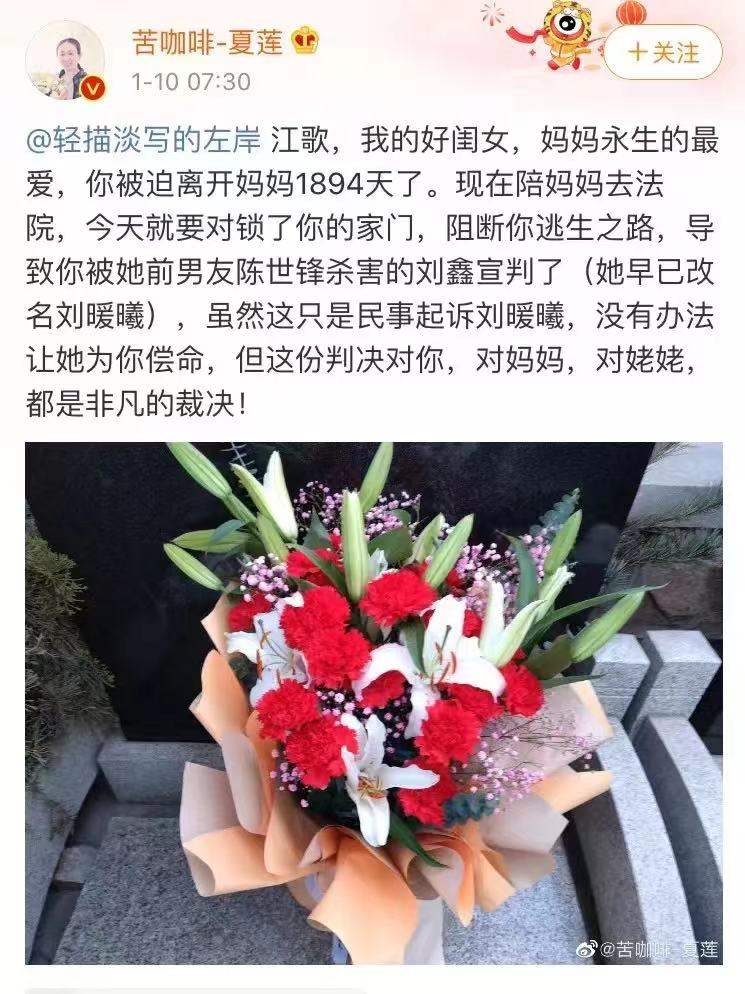 随后,江歌妈妈在网上写道:赔偿金额并不重要,最为关键的是,用法律还原了我江歌被害得真相。