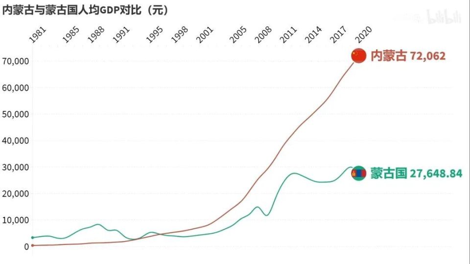 随着苏联经济状况恶化,进入80年代,蒙古经济发展陷入停滞,同时期中国实行改革开放,到1990年,中国内蒙古GDP已是外蒙古的3.1倍。