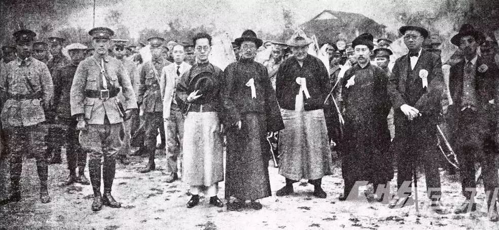 1927年4月18日,前排左二起:蒋介石、胡汉民、蔡元培、吴稚晖等在南京政府成立典礼上