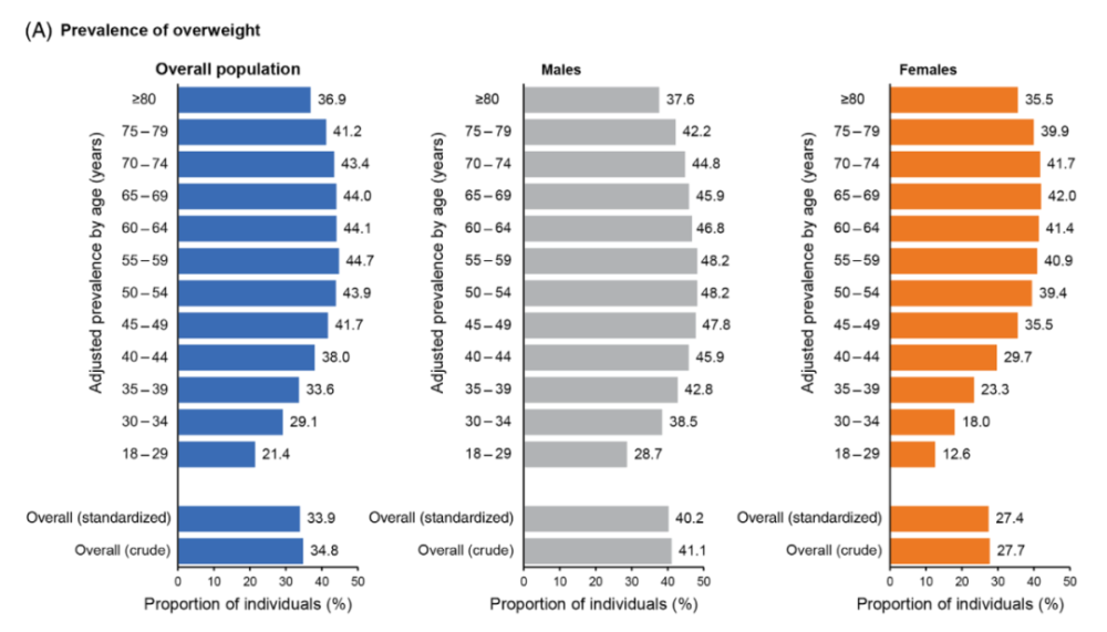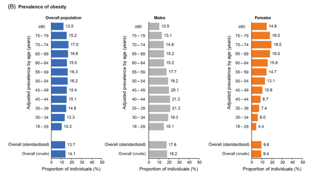 超重和肥胖的患病率在不同年龄段的男性和女性之间存在差异,男性的超重和肥胖的患病率高峰比女性年轻。男性超重患病率在50-54岁达到峰值,在55-59岁保持,而女性在65-69岁达到峰值。男性的肥胖患病率在35-39岁达到峰值,而女性在70-74岁达到峰值。
