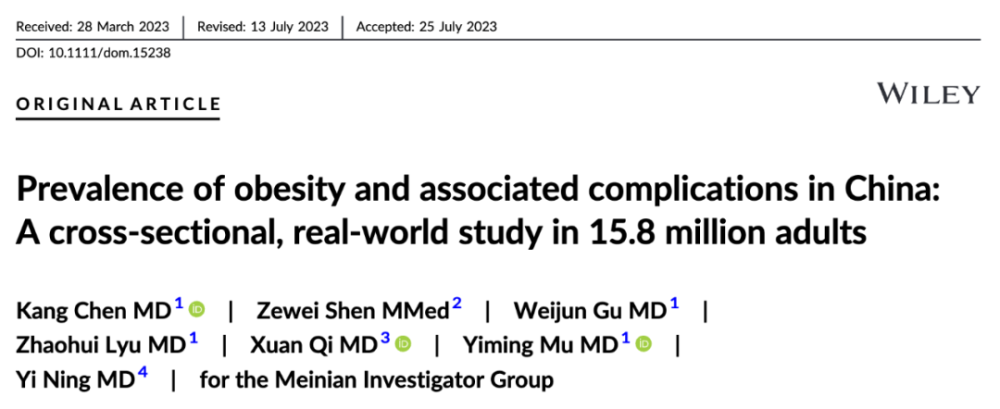 2023年8月17日,解放军总医院(北京301医院)母义明教授团队联合诺和诺德及美年健康研究院在 Diabetes, Obesity and Metabolis 期刊发表了题为:Prevalence of obesity and associated complications in China: A cross-sectional, real-world study in 15.8 million adults(中国肥胖患病率及相关并发症:1580万成年人的横断面真实世界研究)的研究论文。