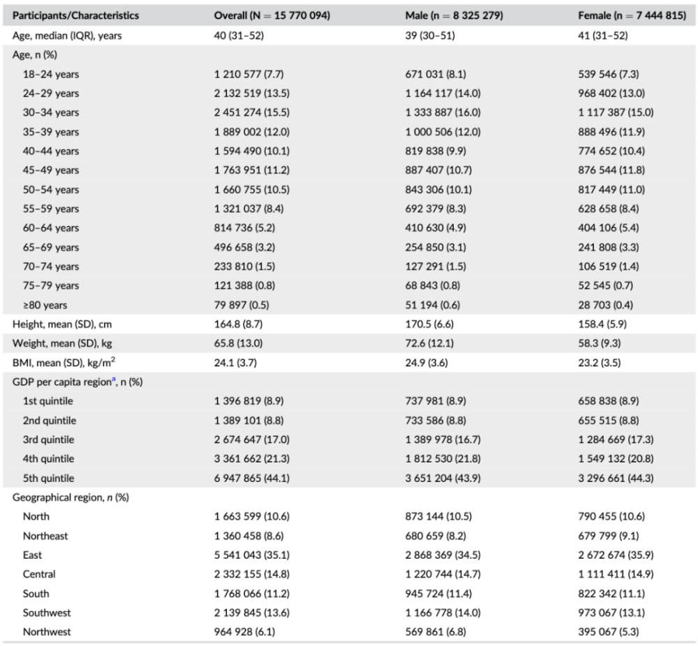 这是迄今为止在中国进行的最大规模的关于超重和肥胖患病率及相关并发症的当代研究,来自全国243个城市的1577094名符合条件的成年人参与(52.8%为男性,中位年龄为40岁,平均BMI=24.1 kg/m2)。按照中国人的BMI分级,34.8%的人超重,14.1%的人肥胖。超重和肥胖在男性中比女性更普遍,男性中超重的比例为41.1%,而女性为27.7%,男性中肥胖的比例为18.2%,而女性为9.4%。与BMI正常者相比,超重/肥胖者的并发症患病率更高。超重/肥胖参与者中最常见的并发症是脂肪肝、前驱糖尿病、血脂异常和高血压。BMI越高,并发症越多。
