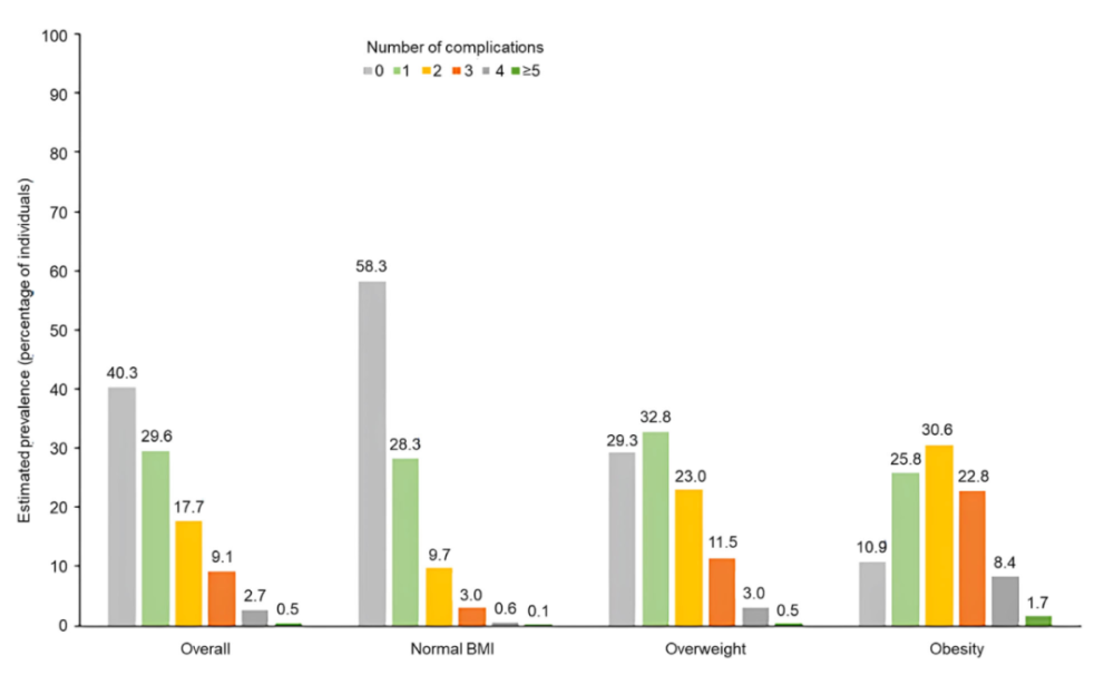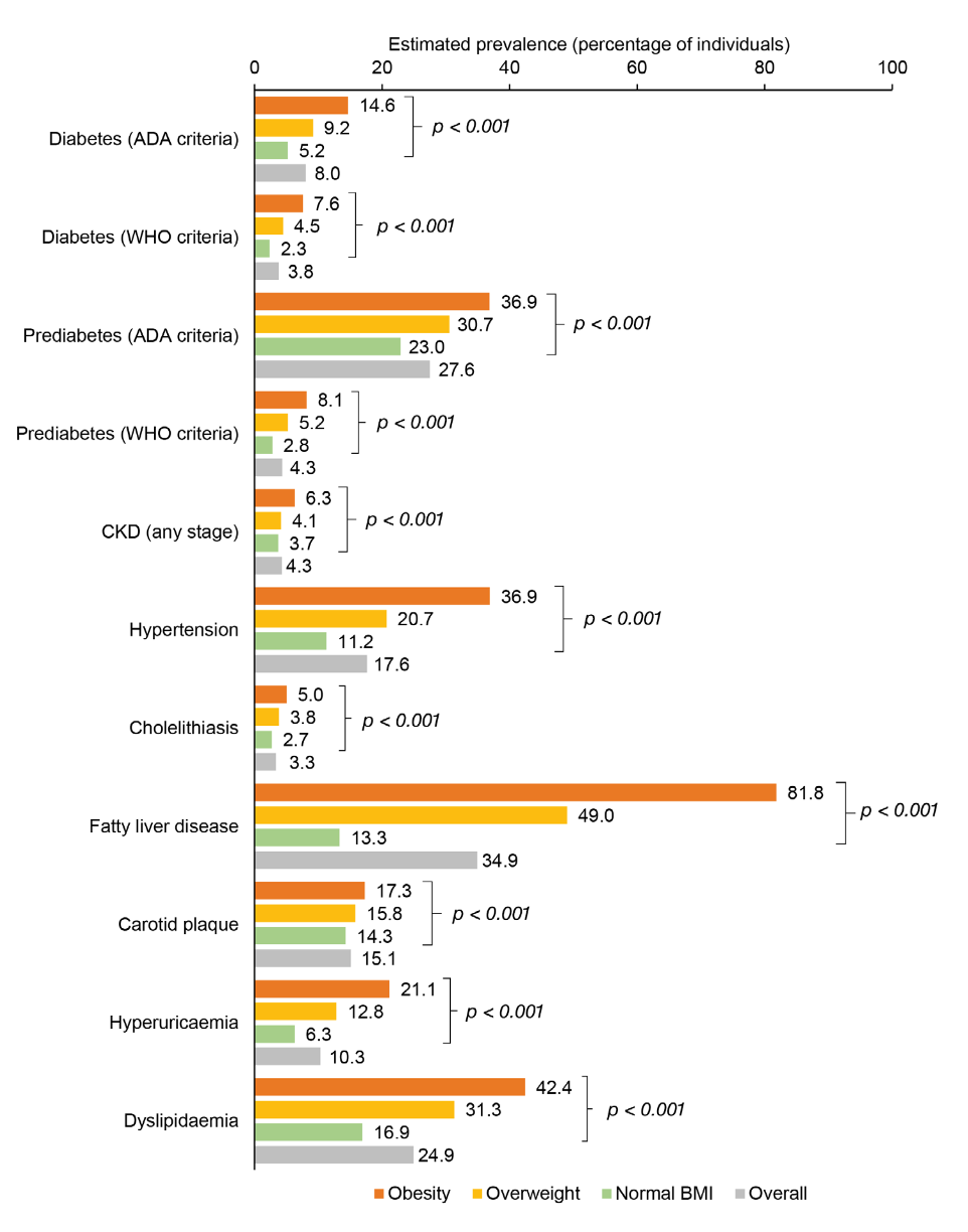 超重和肥胖者最常见的并发症是脂肪性肝病、前驱糖尿病、血脂异常和高血压,使用中国人的BMI分级,超重者的脂肪肝并发症为49.0%、肥胖者的脂肪肝并发症为81.8%,前驱糖尿病分别为30.7%和36.9%,血脂异常分别为31.3%和42.4%,高血压分别为20.7%和36.9%。相比之下,BMI正常者,最常见的并发症是前驱糖尿病(23.0%)、血脂异常(16.9%)、颈动脉斑块(14.3%)和脂肪肝疾病(13.3%) 。