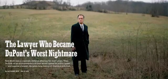 正好,前两天我在《纽约时报杂志》上看到一篇调查报道,讲的是美国一个普通的环境律师如何在监管和法规缺位的情况下,用16年的时间扳倒化工巨头杜邦的故事。