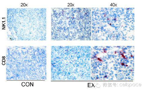 图3。肿瘤组织染色切片,左图为不运动的对照组,右图为运动组,红色染色细胞为NK细胞。在对照组中,NK细胞出现频率过低,几乎不可见。在运动组中,NK细胞明显增多。