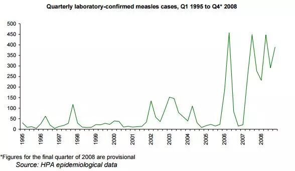 1995~2008年,英国地区每季度麻疹患病者的数量变化。相较于1998年,2006年的麻疹感染率翻了20倍。图片来源:HPA epidemiological data