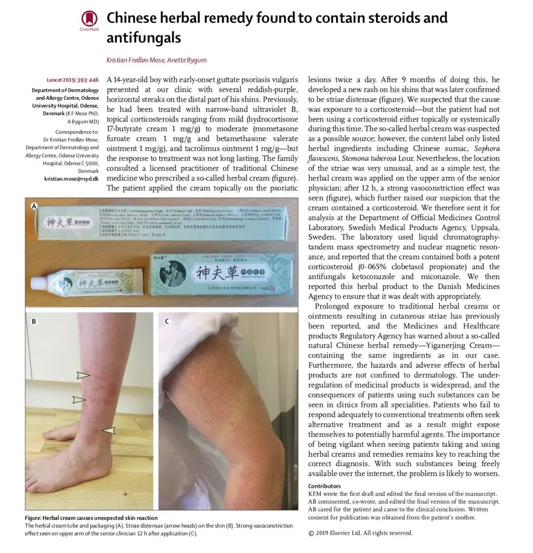 这是丹麦医生发表在《柳叶刀》杂志上的一篇文章,说遇到一个儿童病人,找中医师看过,开了一种叫神夫草的中草药膏,因为用了之后的表现被怀疑有激素,然后送去瑞典检验,结果发现含有丙酸氯倍他索和抗真菌药物酮康唑和咪康唑。