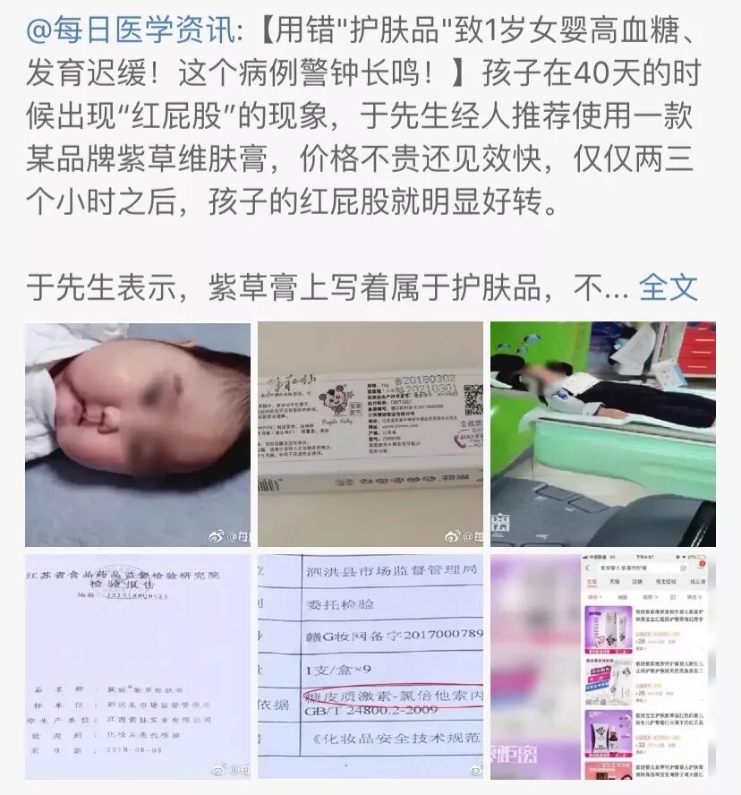 去年一个新闻报道,一个40天的孩子,使用的一款纯天然“紫草维肤膏”,后来出现高血糖、发育迟缓,向心性肥胖,然后检测这款护肤品,结果发现含有激素,成份也就是氯倍他索。