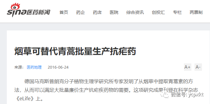 德国马普分子植物生理学研究所专家发明了一种特殊的方法,从烟草中也能提取青蒿素,从而可以大批量廉价生产抗疟疾药物。