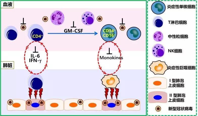 新冠肺炎疫情爆发后,通过安徽省、中国科大的应急项目支持,中国科大魏海明教授团队第一时间就将实验室前移到附一院感染病院区,与徐晓玲主任医师团队开展联合攻关。研究团队对33例新冠肺炎病人血液30项免疫学指标的全面分析,发现了新型冠状病毒感染致重症肺炎炎症风暴的关键机制:新型冠状病毒感染后,迅速激活病原性 T 细胞,产生粒细胞-巨噬细胞集落刺激因子 GM-CSF 和白介素 6 等因子。GM-CSF 会进一步激活 CD14+CD16+炎症性单核细胞,产生更大量的白介素 6 和其他炎症因子,从而形成炎症风暴,导致严重肺部和其他器官的免疫损伤。因此,白介素 6 和 GM-CSF 是引发新冠肺炎患者炎症风暴中的两个关键炎症因子。