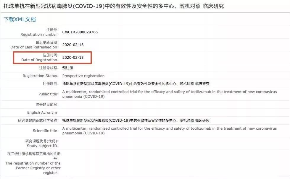 目前,炎症风暴的多中心研究项目已通过伦理审查,并于2020年2月6日正式立项。2月13日,据中国临床试验注册中心显示,“托珠单抗在新型冠状病毒肺炎(COVID-19)中的有效性及安全性的多中心、随机对照临床研究”已经通过临床试验注册(注册号:ChiCTR2000029765 )。该项研究的目的是评估托珠单抗治疗普通型NCP(含重症高危因素)及重型NCP患者的有效性和安全性。