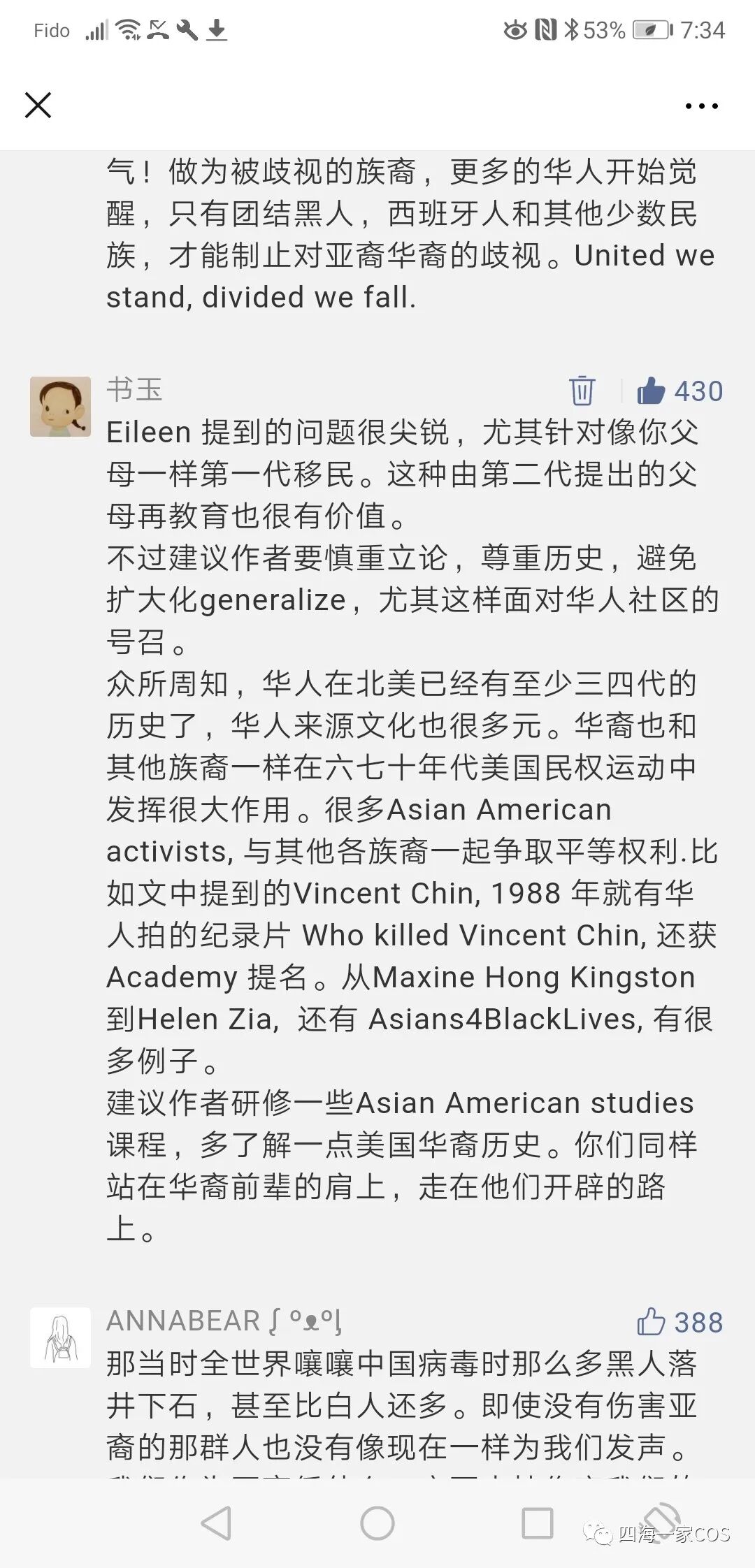 华裔在北美已经一百多年历史,起码已经有三四代,而且来源很广,文化上也多元,有很多华裔亚群落。据我观察这次争论主要涉及的是最近三四十年来自大陆的移民及其二代。耶鲁女生的信引发争议的主要问题就在于她定义华裔时的以偏概全 generalization 和历史匮乏。她以自己父母和身边人为依据得出华裔大都沉默自私种族歧视,以及华人在美国的地位权力是靠非裔争取保护来的,都是偏颇甚至错误的mischaracterization,伤害了很多华人。如果她了解一点Asian American Studies,就知道华裔和其他族裔一样,为美国的平权运动中做出自己的贡献,比如为Vincent Chin事件奔走的主要力量都是华裔,包括他的母亲,也从受害者成为抗争者。