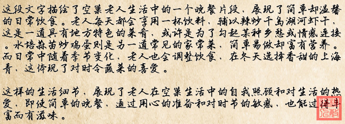 这顿饭简单但富含营养,适合独居老人的日常饮食。