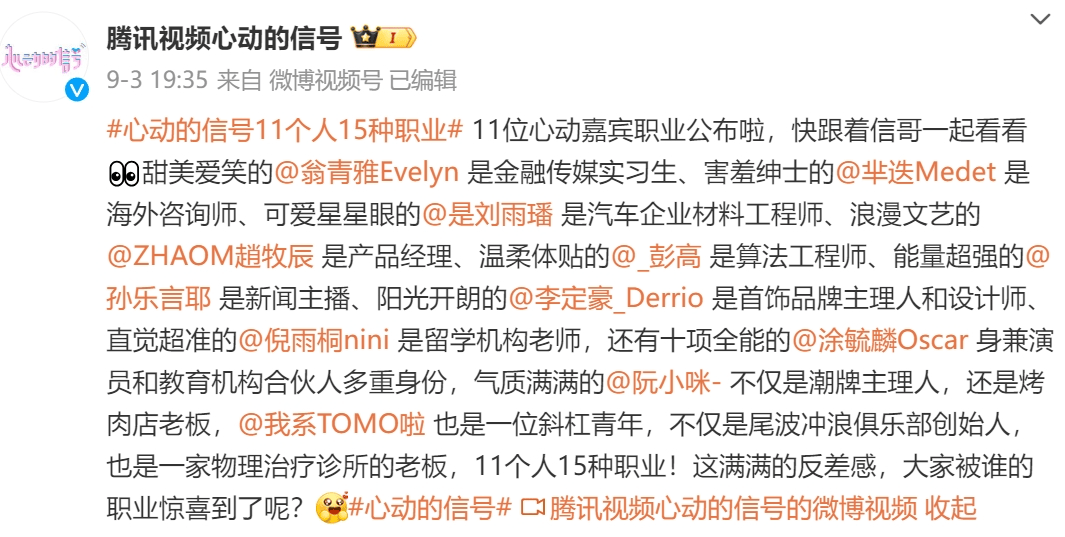 节目组打出的官方tag是“11个人15种职业”,仔细一看, 都是适合在小红书起号拍vlog的那类工作。