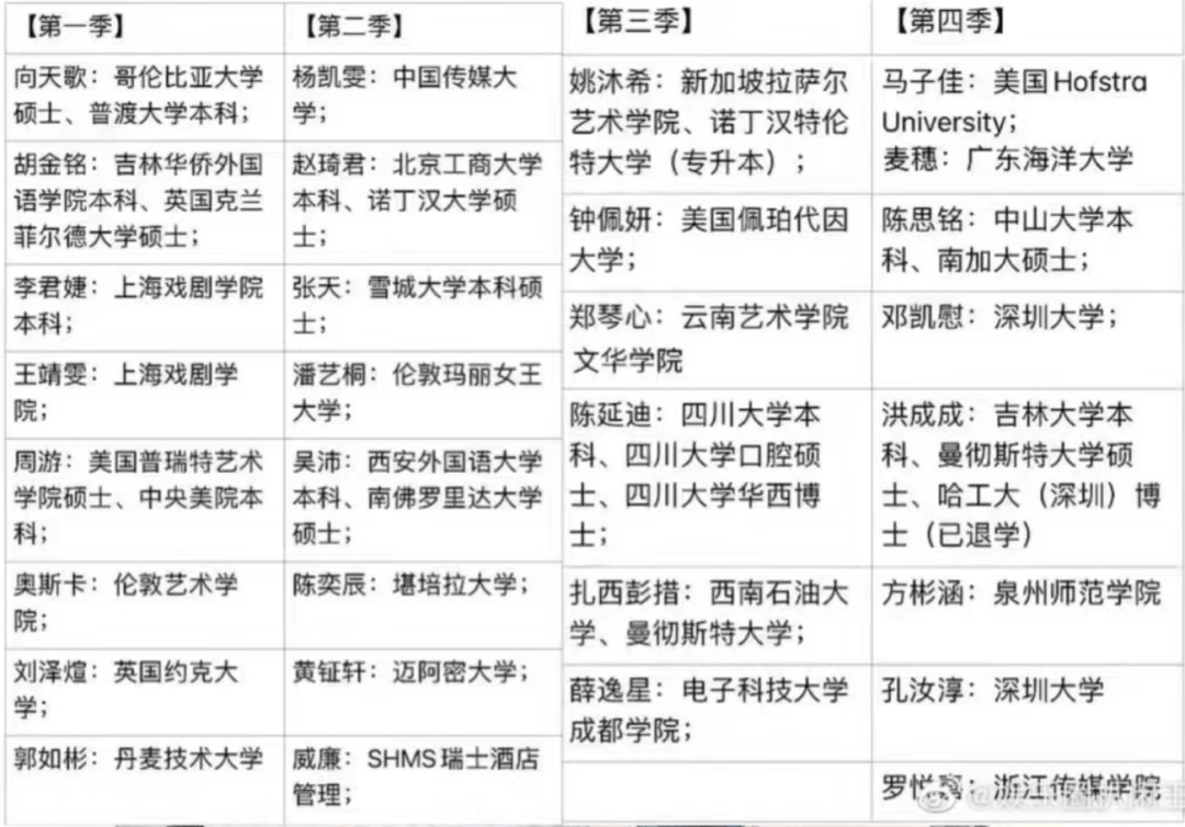 随着话题发酵越来越大,网友没有放过每一个曾经在恋综里背靠母校开屏的孔雀,都揪出来再笑一遍。