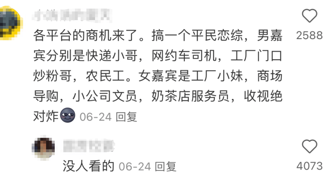 说白了,网友的吐槽直指 这些所谓“素人恋爱综艺”其实远在云端: