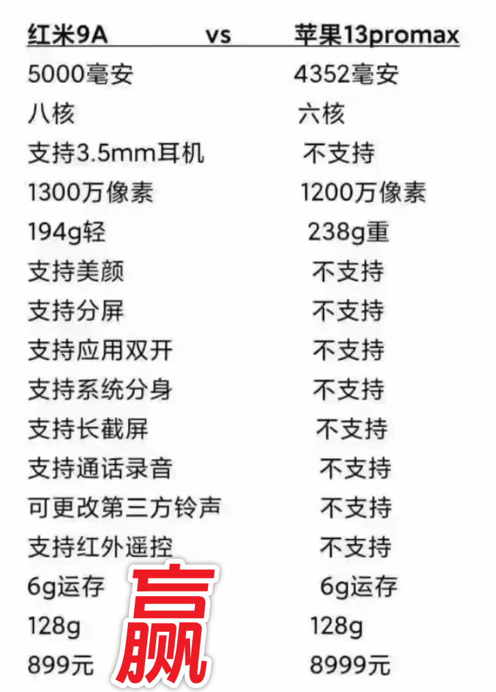 米氏对比法泛指那些:在两款产品进行对比时,强调对自己有利的信息,对自己不利的缺点则避而不谈,从而突出自家产品优点、价值的营销方式。最典型的就是这张图,红米9A对比iPhone 13 Pro Max,哪怕是一台百元机,只要角度选得对,也可以吊打万元机。
