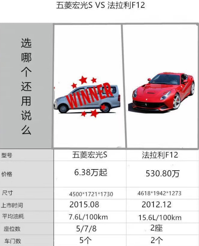 比如五菱宏光S对比法拉利F12,若只看容量、载量、油耗,五菱宏光就成了“赢家”。
