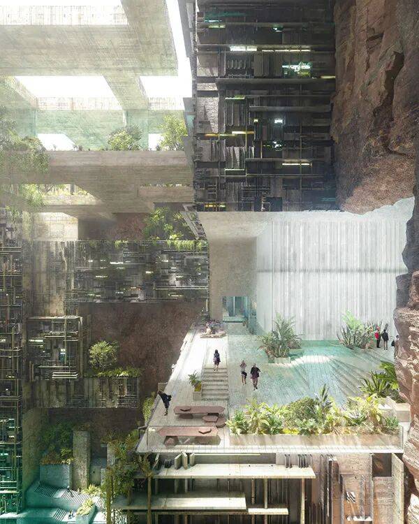 整个建筑围绕着一个100米高的巨型中庭展开,想象一下,一个被掏空的山体,内壁全是步行道、庭院和阳台。