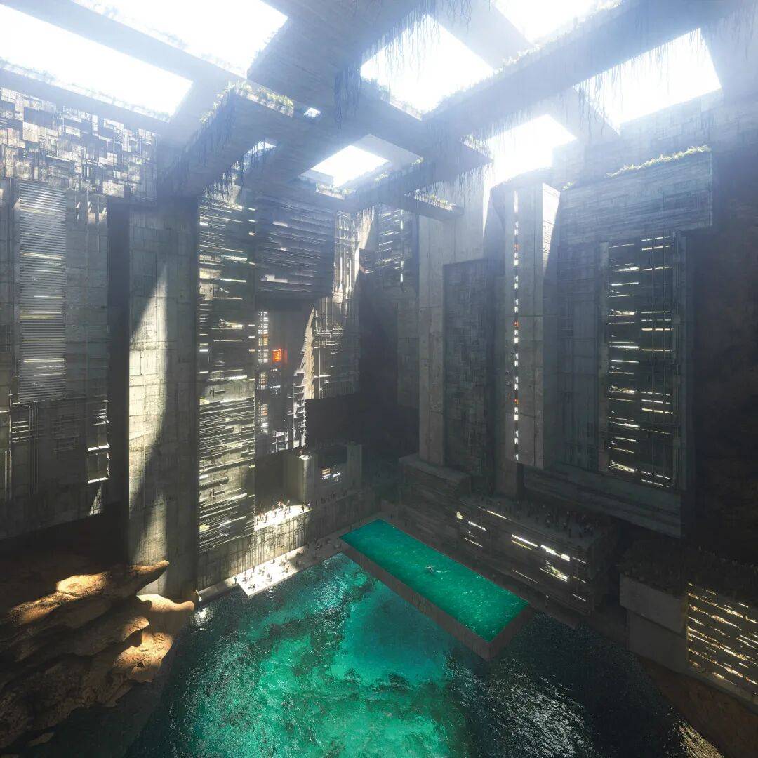 粗犷的混凝土墙体上,穿插着露台、水池甚至室内瀑布,有种末日废土风混合精致度假感的奇妙张力。
