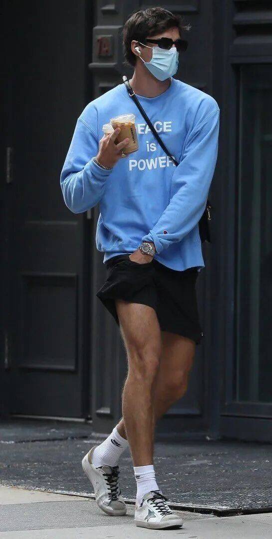 蓝色卫衣搭配三分运动裤,很好地拉长了腿部曲线。