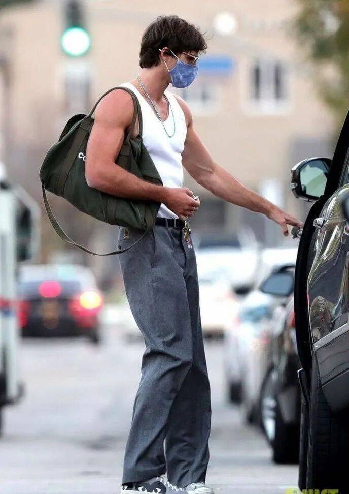 白色背心、灰色西裤,再挎个军绿色大包,视觉上非常干净。