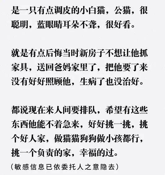 当时,网友因为搬新家,担心小猫抓家具,就送到了父母家里。
