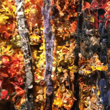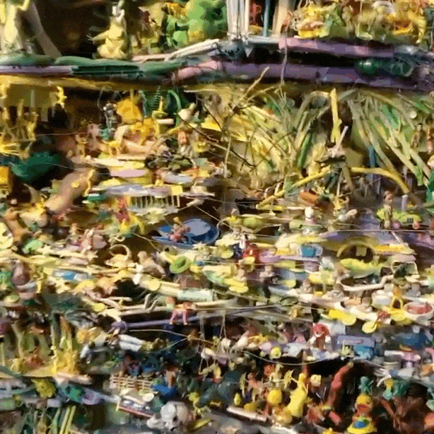 但近看,全都是塑料玩具、纸板、网兜、毛巾,还有塑料条等一堆杂乱的废弃物。