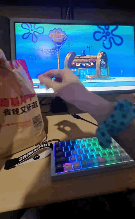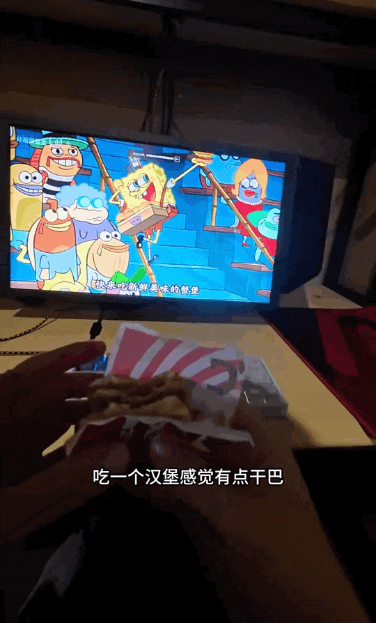 之后便锁上门,一边看海绵宝宝一边吃汉堡。