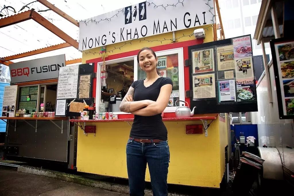 而这餐车文化不仅仅是一个饮食界的革命,更创造了许多人物。就像你别小看朱迪一样,这位泰国美女 Nong 在2003年带着70美金和2个皮箱来到美国,一手打造了波特兰闻名的海南鸡饭餐车,目前已开到3家分店。 Nong's Khao Man Gai 把我们熟悉的海南鸡饭,带上了国际舞台。她更摇身一变,成为了餐车神话,CNN,The New York Times,Food Network 都有相关报导。