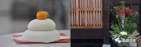 过年时日本人都会在家里摆上年糕,日语称为镜饼,记得还要在上面放一颗橘子。也要在门口放上一颗装饰用的松树,称做门松。