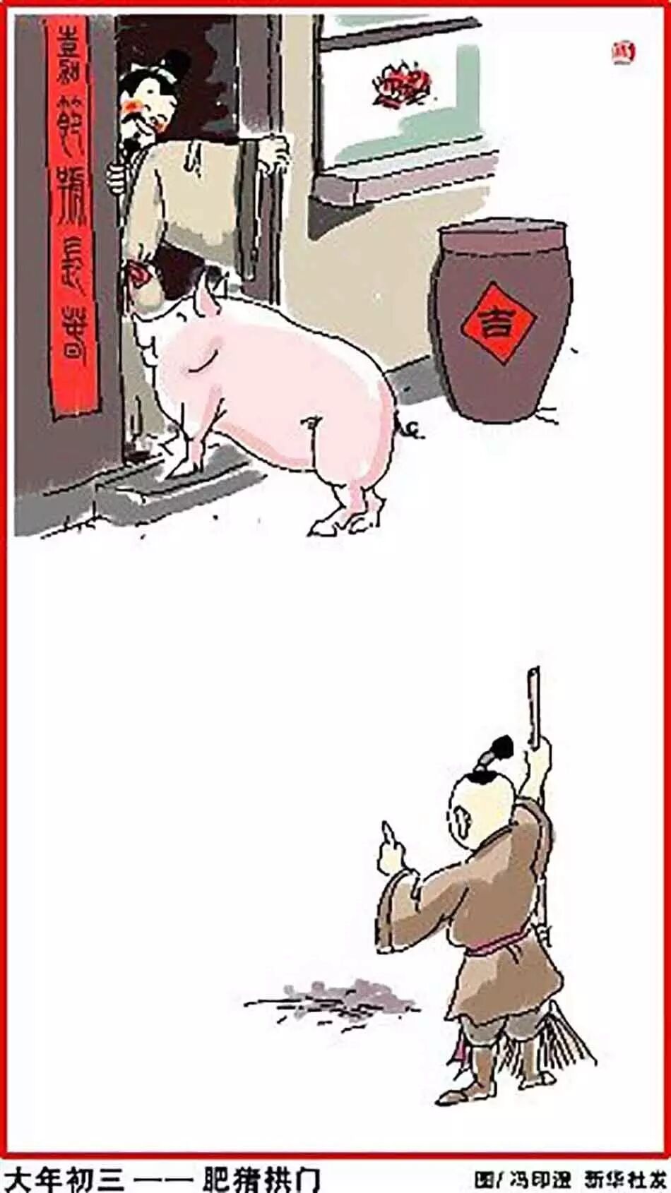 正月初三,肥猪拱门。农历正月初三,又称为“猪日”。 自秦汉以来,传统的看法是正月初一为鸡日,初二为*****,初三为猪日,初四为羊日,初五为牛日,初六为马日,初七为人日。传说这是因为女娲创造万物生灵的时候,先造的六畜,后造的人。