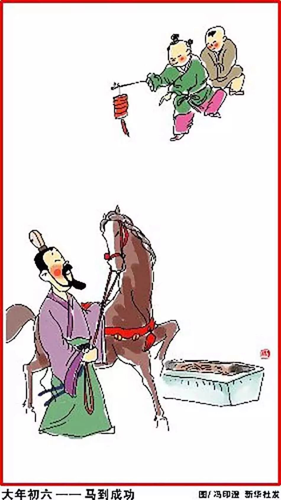 正月初六,马到成功。正月初六“送穷”,是我国古代民间一种很有特色的岁时风俗,其意是祭送穷鬼、穷神。唐代诗人姚合写有诗《晦日送穷三首》,其中第一首云:“年年到此日,沥酒拜街中。万户千门看,无人不送穷。”