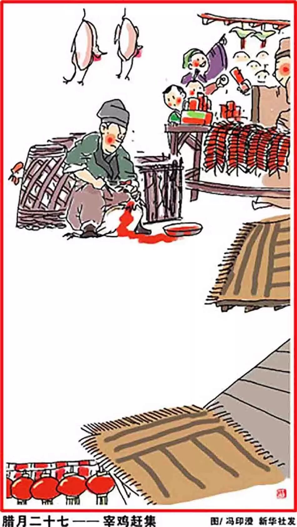 腊月廿七,宰年鸡、赶大集。这其实是取谐音,“鸡”同“吉”,有吉利、吉祥如意的意思。杀好的鸡,不在当天吃,要一直放到除夕才能吃,而且,除夕夜吃的时候也不能吃完,要留一点,表示天天大吉大利。