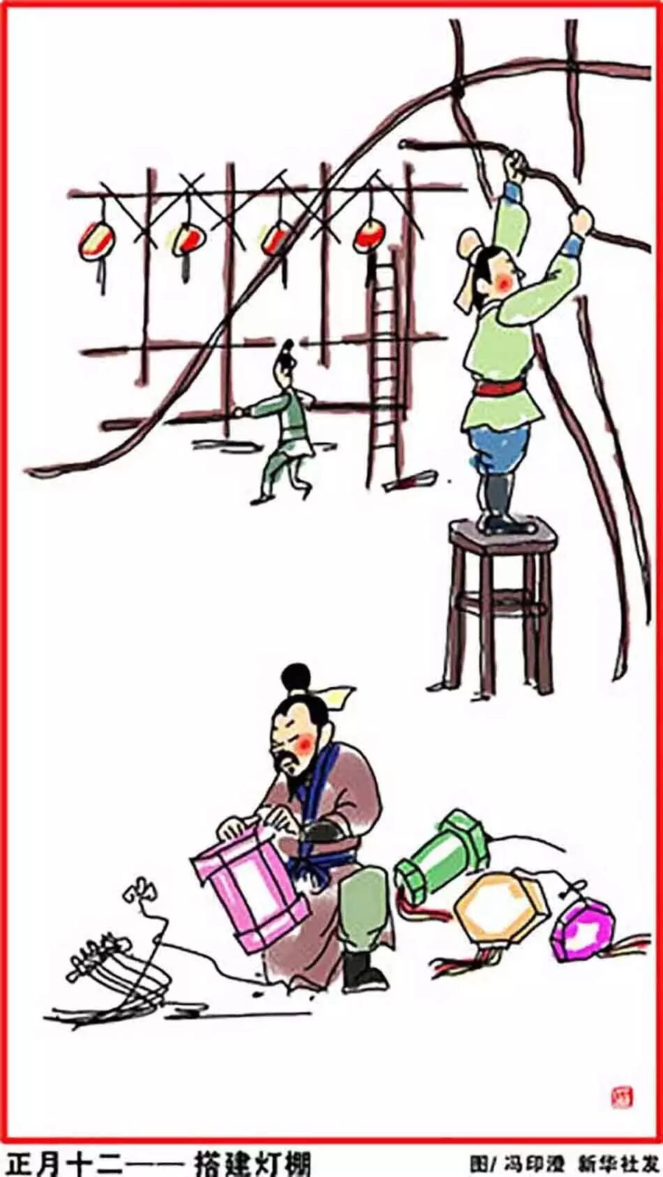 正月十二,搭建灯棚。意思是元宵节将近,村庄中的管事人从这一天开始就要召集能工巧匠和青壮年制作花灯,做元宵节赏灯的各种准备工作。