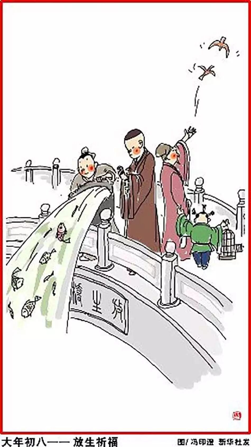 正月初八,放生祈福。传说,每人每年都有一位值年星宿,人一年的命运如何,完全掌握在这位值年星宿手里,而每年正月初八为诸星君聚会之期,故人们在这天祭祀星君,便有可能获得星君的垂佑。