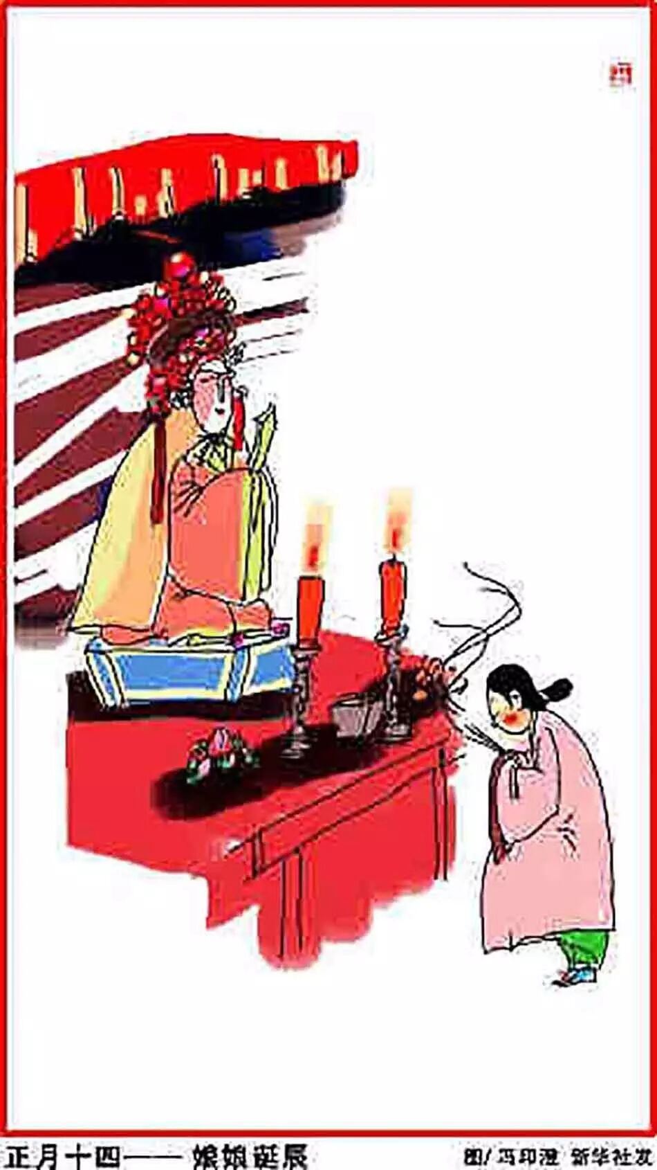 正月十四,娘娘诞辰。民间将正月十四这一天称为“临水娘娘”的诞辰。传说临水娘娘姓陈,后来成了拯救难产妇女的神仙。于是民间立祠奉祀,称为“临水娘娘”、“顺天圣母”。这天也要搭建灯棚,悬灯结彩,迎接一年一度的元宵佳节。