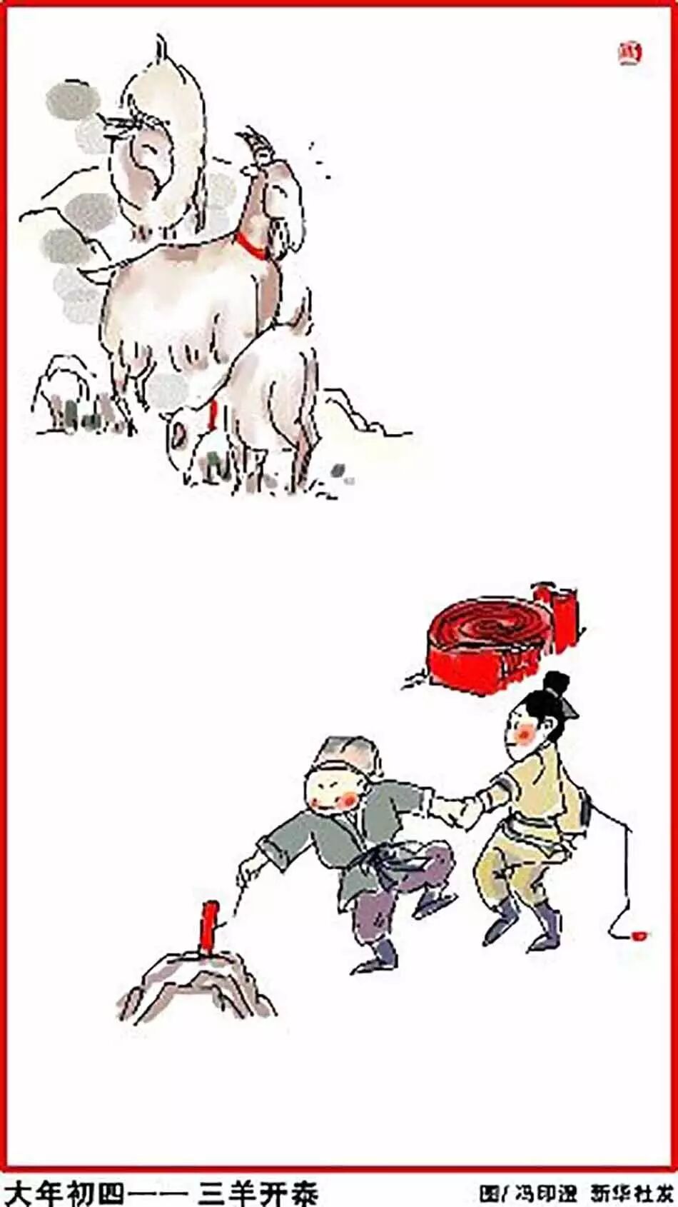 正月初四,三羊开泰。灶王爷要查户口,恭迎灶神回民间。相传正月初四灶王爷要点查户口,所以家家户户都要守在家里,准备丰富的果品,焚香点烛并燃放鞭炮,以示恭迎。