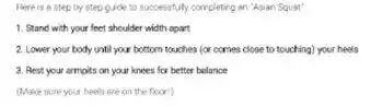像亚洲人一样全脚着地的亚洲蹲是让老外难以解释的迷思。他们甚至还出了个教程,教美国人怎么蹲!