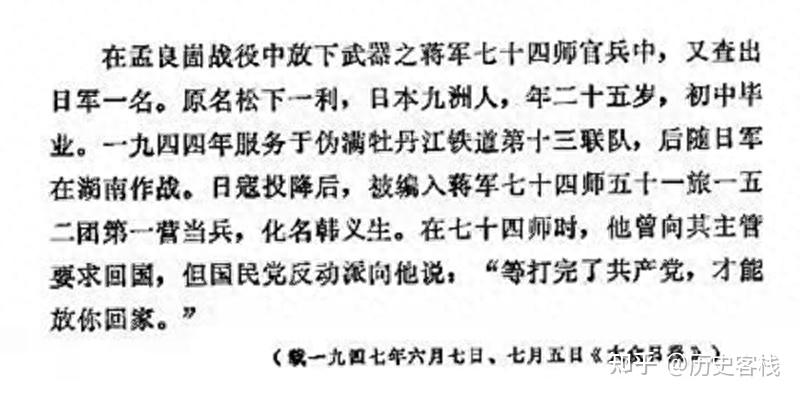 可是,1945年7月,刚参加完湘西会战的国民党军第74军急需补充兵力,遂在湖南各民团中征兵,曾是日本正规军的松下一利自然逃不过。一开始,松下一利依然谎称自己叫韩义生,并称在日军时是汽车兵,遂被编入第51师运输连。事情很快暴露,人家发现他根本不会开车,于是又被编入第51师152团1营,成了步兵。在第51师,松下一利碰到了自己的一个九州老乡——加藤。1946年5月,第74军改编为整编第74师,第51师改称第51旅,松下一利不想打仗,他提出要“回”朝鲜去,但国民党军没搭理他。