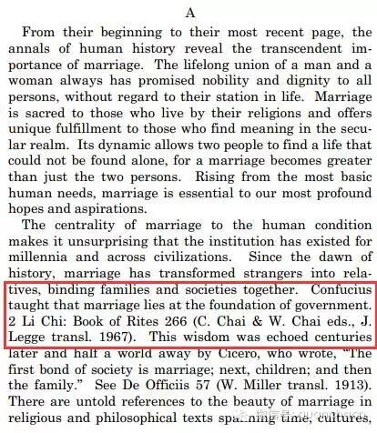 判决意见书开头部分,即第8页中,一段英文是这样写的:Confucius taught that marriage lies at the foundation of government.2 Li Chi:Book of Rites 266.额…孔子教导说,婚姻是政体的根基。