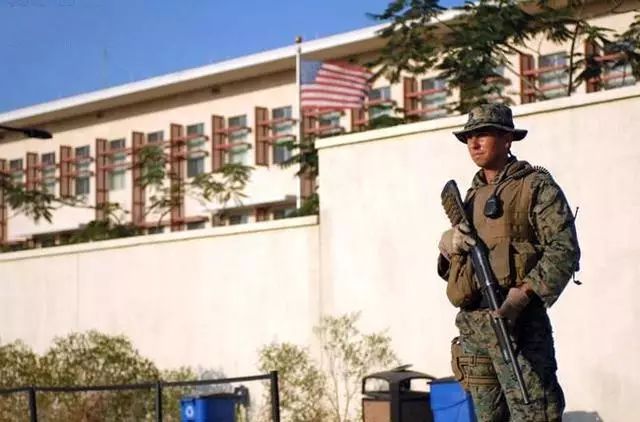 在全世界范围内,除中国之外,与美国建交的这些国家里,所有的美国使领馆门口都由全副武装的海军陆战队员在守卫,即便是俄罗斯、英国、法国、德国这些大国也是如此。