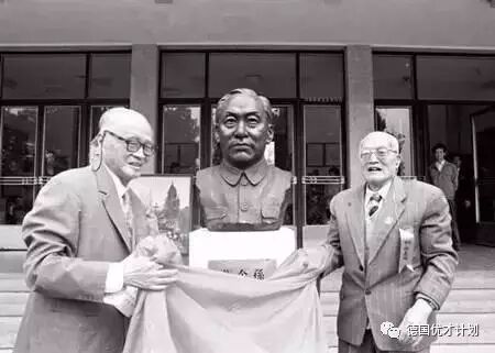 1995年4月30日,著名科学家施嘉炀和叶企孙的弟子王淦昌(左),在清华大学为新落成的叶企孙铜像揭幕
