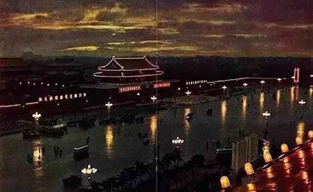 晚霞与夜幕下的天安门广场。拍摄位置应该是在人民大会堂楼顶。