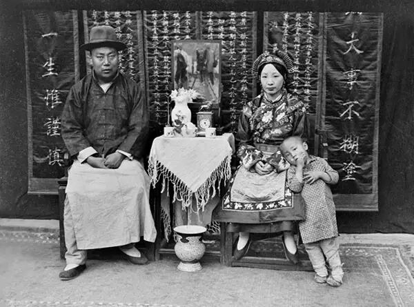 1917年,四川省理县,时任杂谷屯守备的高益斋(藏族)与妻子索黛玉及孩子。甘博/摄。