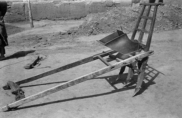由牲畜牵引,后面有人把扶,用来完成开沟和播种两项工作,这种农具在东北使用比较普遍,它也是现代播种机的前身。