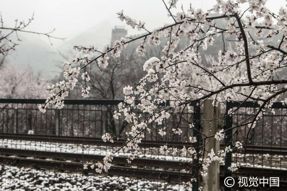 2017年3月24日,北京。阳春三月,受冷空气影响,当日北京迎来了一场春雪,居庸关长城脚下,雾气蒙蒙,洁白的残雪与烂漫的山花相映,列车穿越花海演绎别样铁道风情,让人流连忘返。